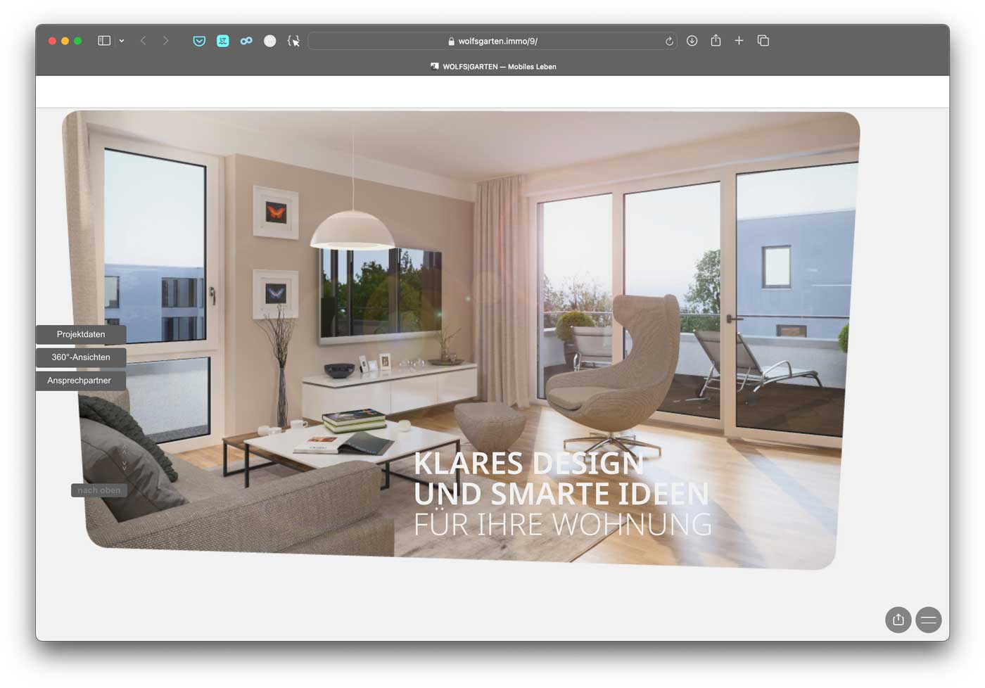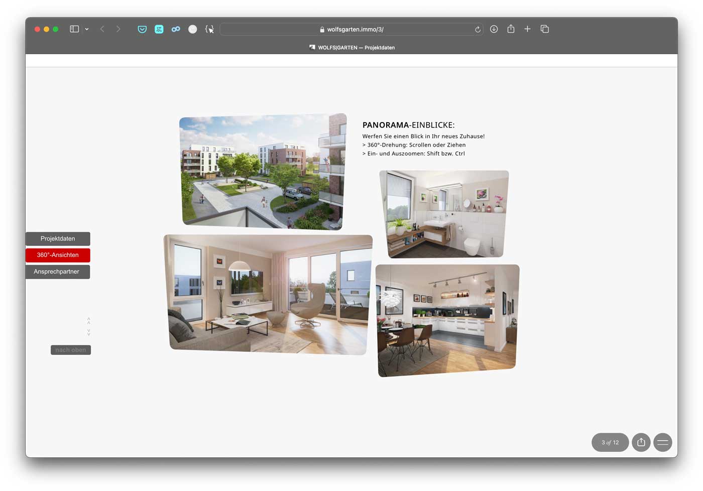 Parallel zum Prospekt mit allen Details zu Grundrissen und Ausstattungen der 115 Wohneinheiten entstand die interaktive Website. Sie erlaubt unter anderem verschiedene virtuelle 360°-Begehungen der Immobilien.