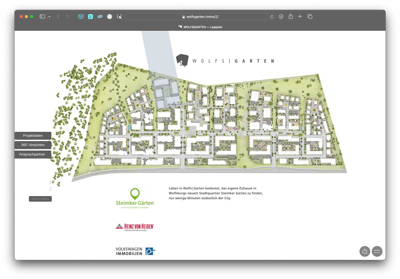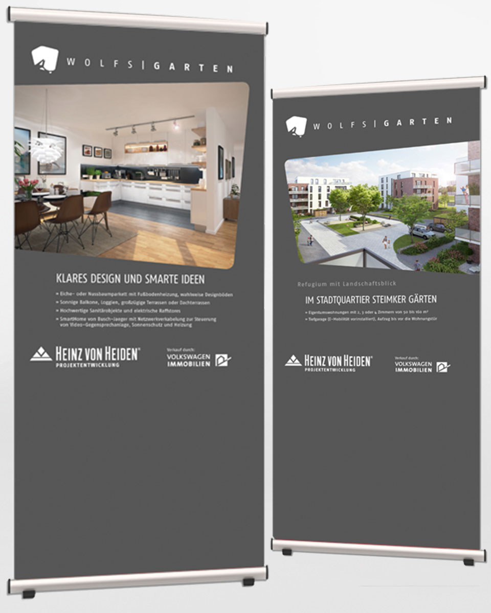 Für das Gebäude-Ensemble „Wolfsgarten“ (in Wolfburgs neuem Quartier Steimker Gärten) haben wir die Wort-/Bildmarke und das Corporate Design entwickelt, die sich in allen Vertriebsmedien wiederfinden.