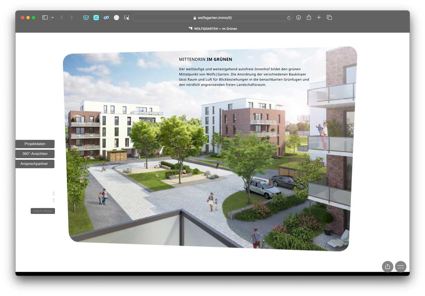 Parallel zum Prospekt mit allen Details zu Grundrissen und Ausstattungen der 115 Wohneinheiten entstand die interaktive Website. Sie erlaubt unter anderem verschiedene virtuelle 360°-Begehungen der Immobilien.